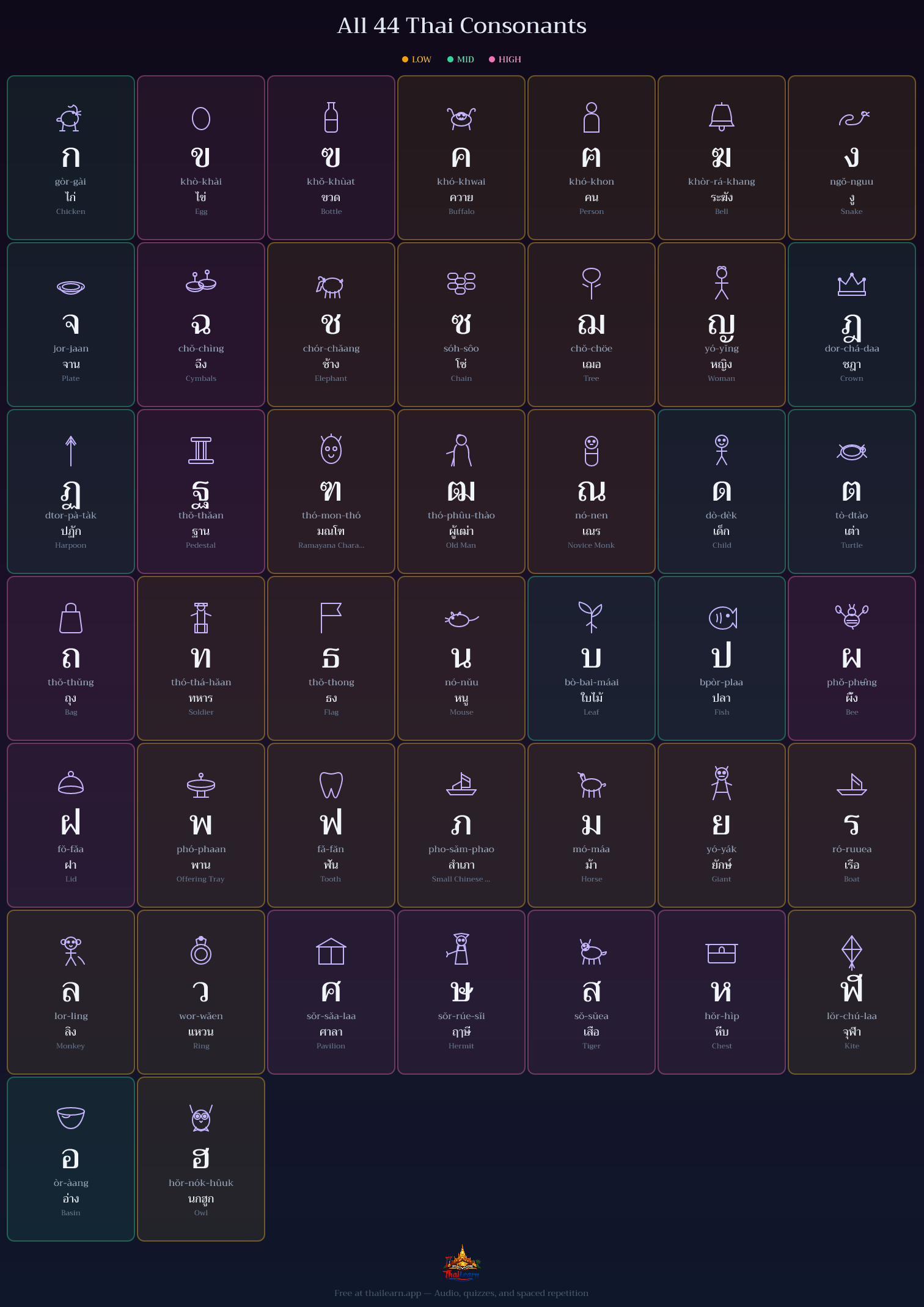 Every Thai word is built from these characters. Tap any card to hear how it sounds — then sign up to master them all with spaced repetition and daily challenges.